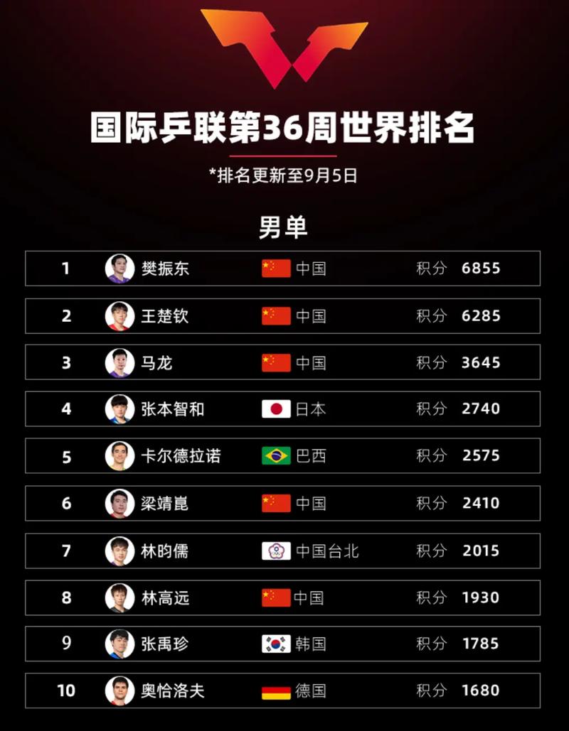 乒乓球运动员的世界排名会不断变化,取决于他们在比赛中的表现。因此,要了解最新的乒乓球个人世界排名,建议定期关注国际乒乓球联合会的官方网站或相关体育新闻。