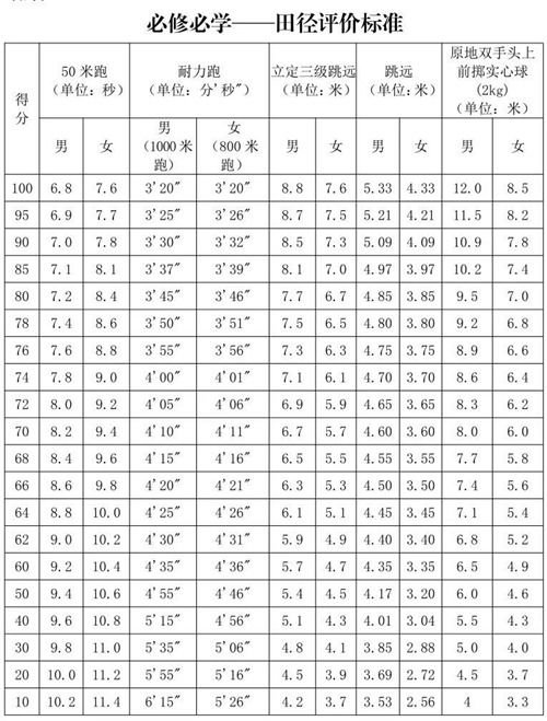 高中体育评分标准