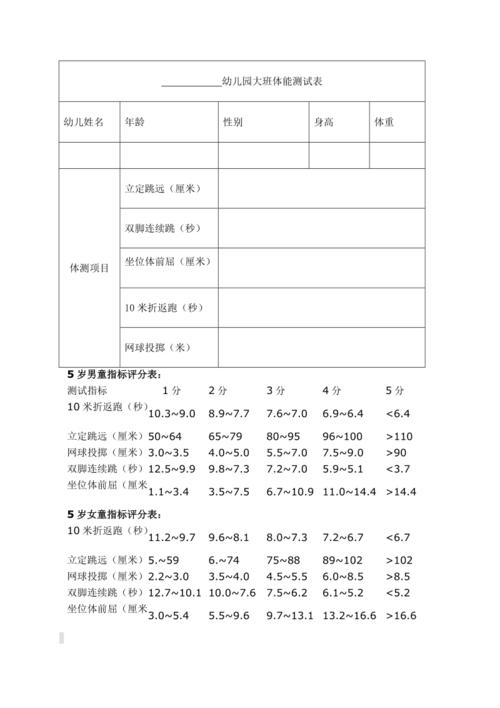大班体育学科评估试卷应包含以下内容: