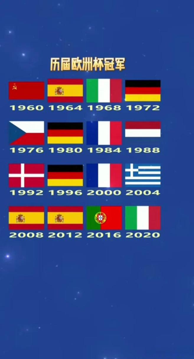 欧洲杯是欧洲足球锦标赛,自1960年起每四年举行一次。以下是一些曾夺得过欧洲杯冠军的国家: